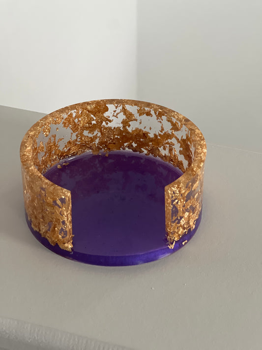Purple and Gold Leaf Resin Coasters with Holder. Set of 4 Round Coasters.